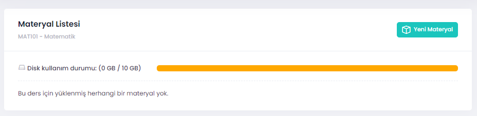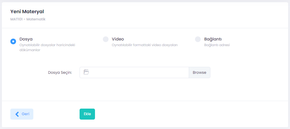 - Panelde materyal eklemek istenen ders seçilir (Örneğin Mat101 Matematik).